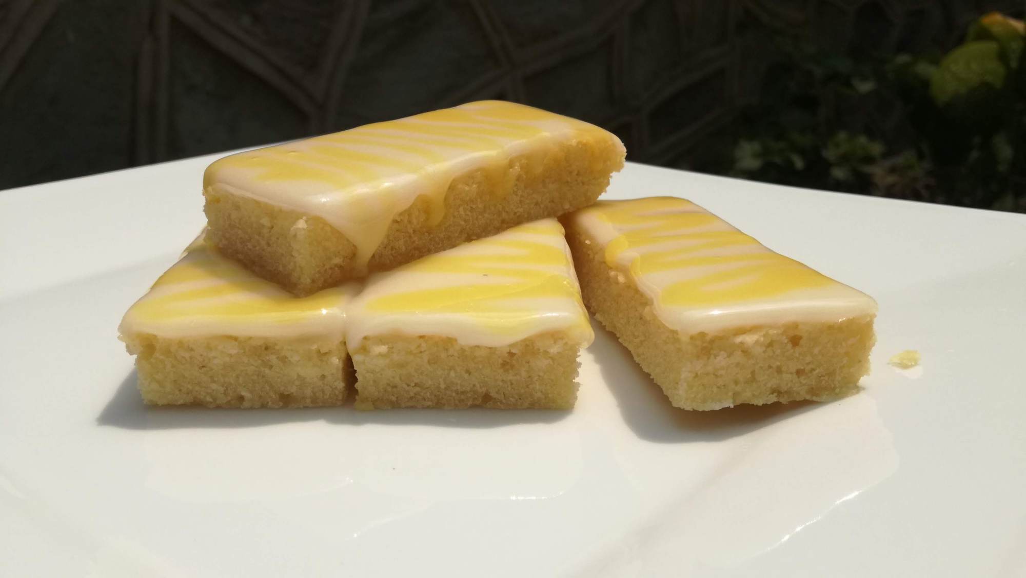 Una vez que haya enfriado la mezcla horneada, cúbrela toda con el glaseado de limón y corta las barritas. Yo opté por agregar las líneas amarillas a las barras ya picadas.