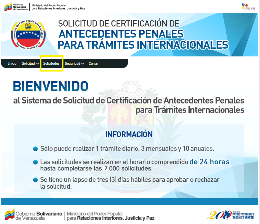 9. Para descargar tu certificación de antecedentes penales, dale click a ‘Solicitudes’ en el menú principal.