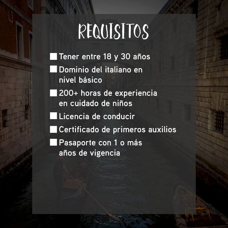 En Italia las familias anfitrionas no están obligadas a adquirir un seguro médico para su au pair, por lo que los aplicantes deben estar en la disposición de adquirir un seguro médico por sus propios medios.